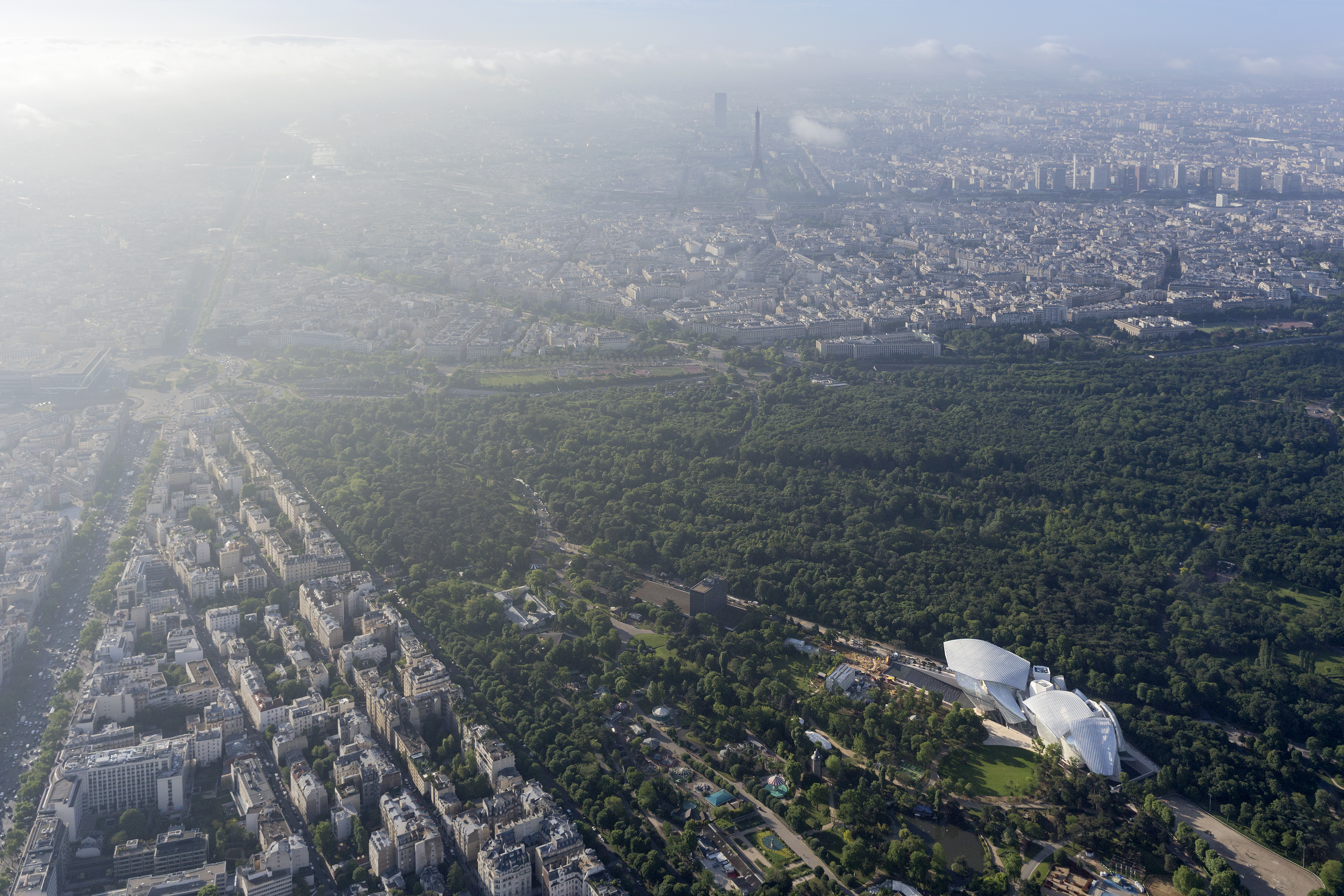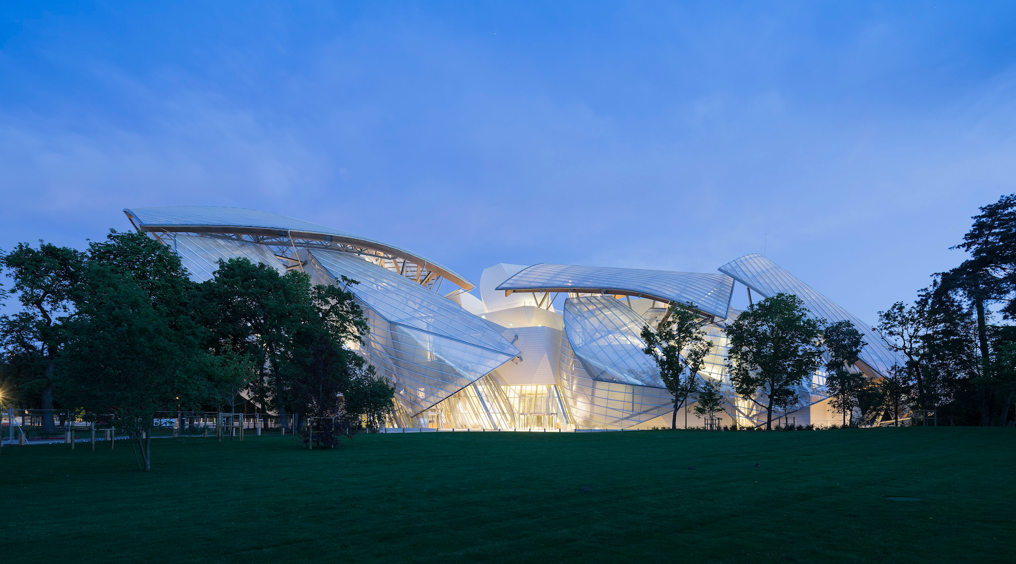 Designed by the American architect Frank Gehry, the Fondation Louis Vuitton resembles an immense vessel made of glass with its twelve sails navigating on the ocean of green of the Bois de Boulogne (french edition).