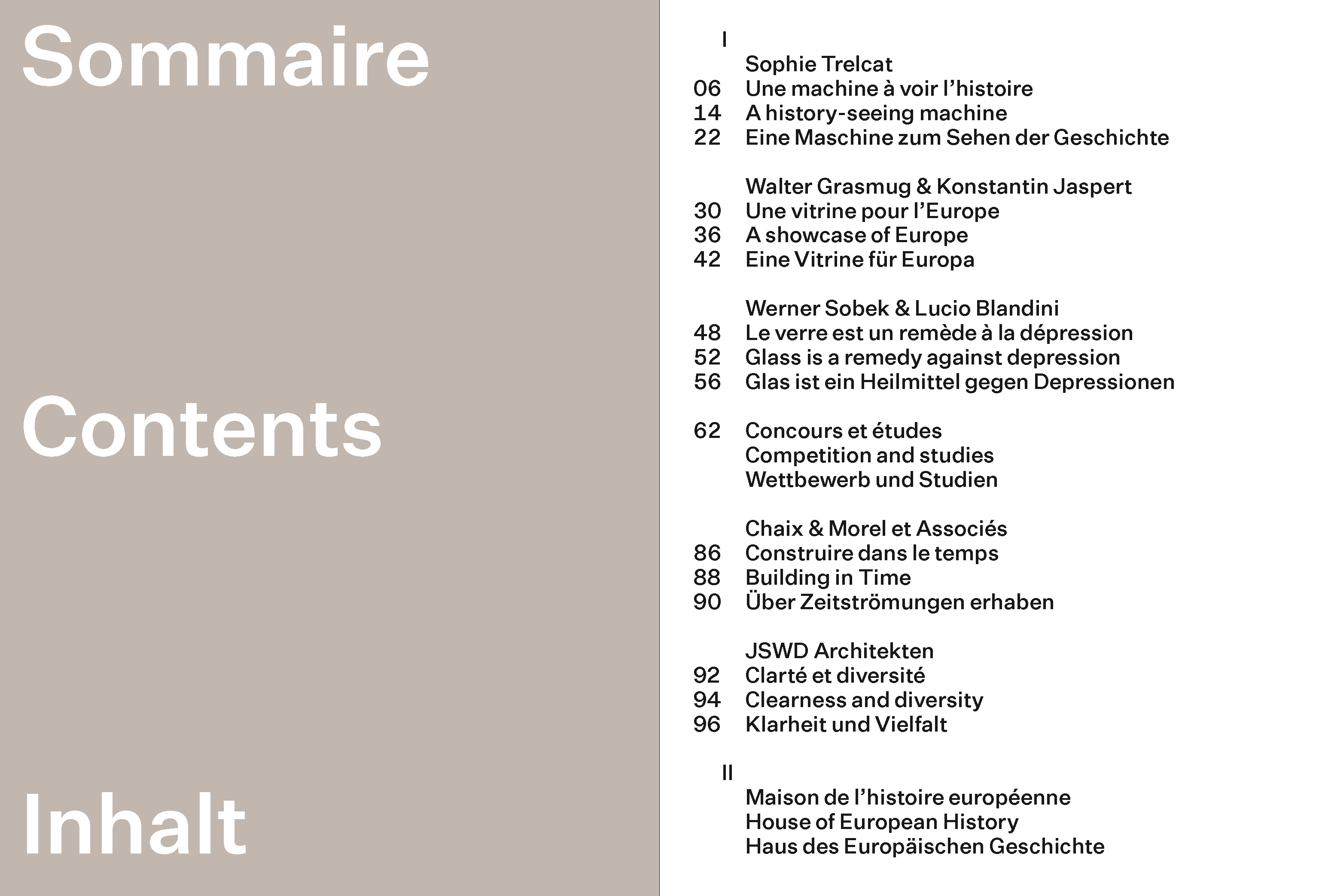 The competition for the renovation and extension of a historic museum building - formerly the George Eastman Dental Institute - was won in 2011 by Chaix and Morel et Associés and JSWD Architekten. Under the direction of Sophie Trelcat, the book House of European History, designed by graphic designers Baldinger and Vu-Huu, presents the history of the architectural project, from its conception to its completion.