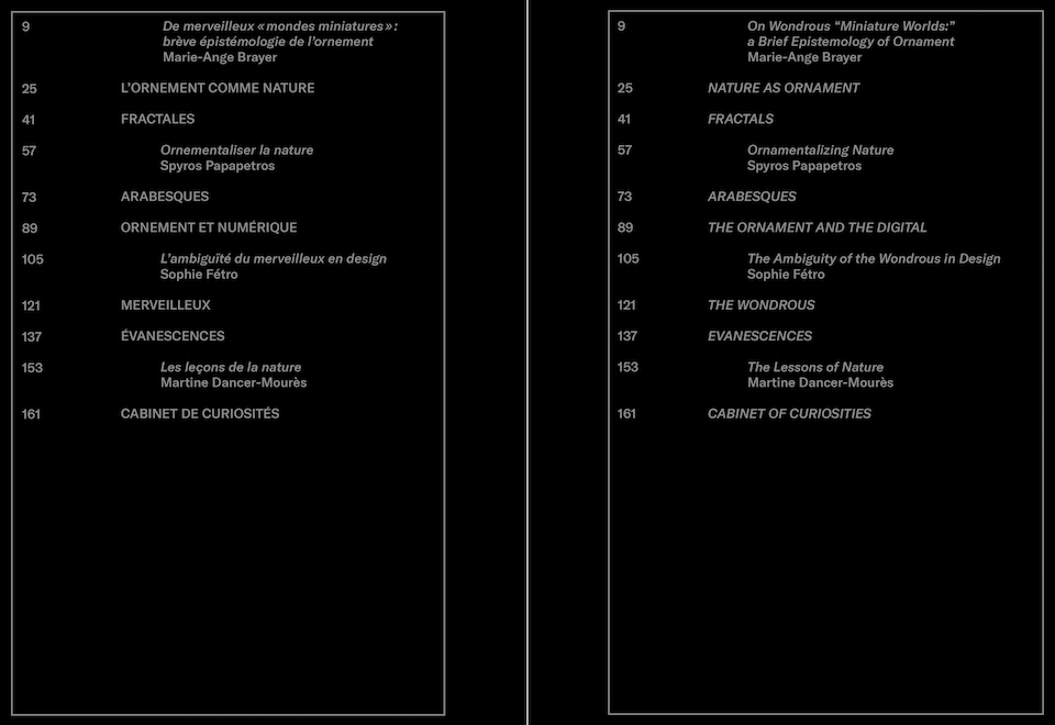 S'appuyant sur une sélection d'œuvres de plus de cinquante artistes, organisée en sept thématiques* accompagnées de notices, quatre essais (Marie-Ange Brayer, Spyros Papapetros, Martine Dancer-Mourès et Sophie Fétro), nous donnent à lire et comprendre, l'évolution du design et de l'ornement, à l'ère du numérique. Une période où l’ornement s’ouvre à la notion de « merveilleux » dans une nouvelle dimension générative de la nature.