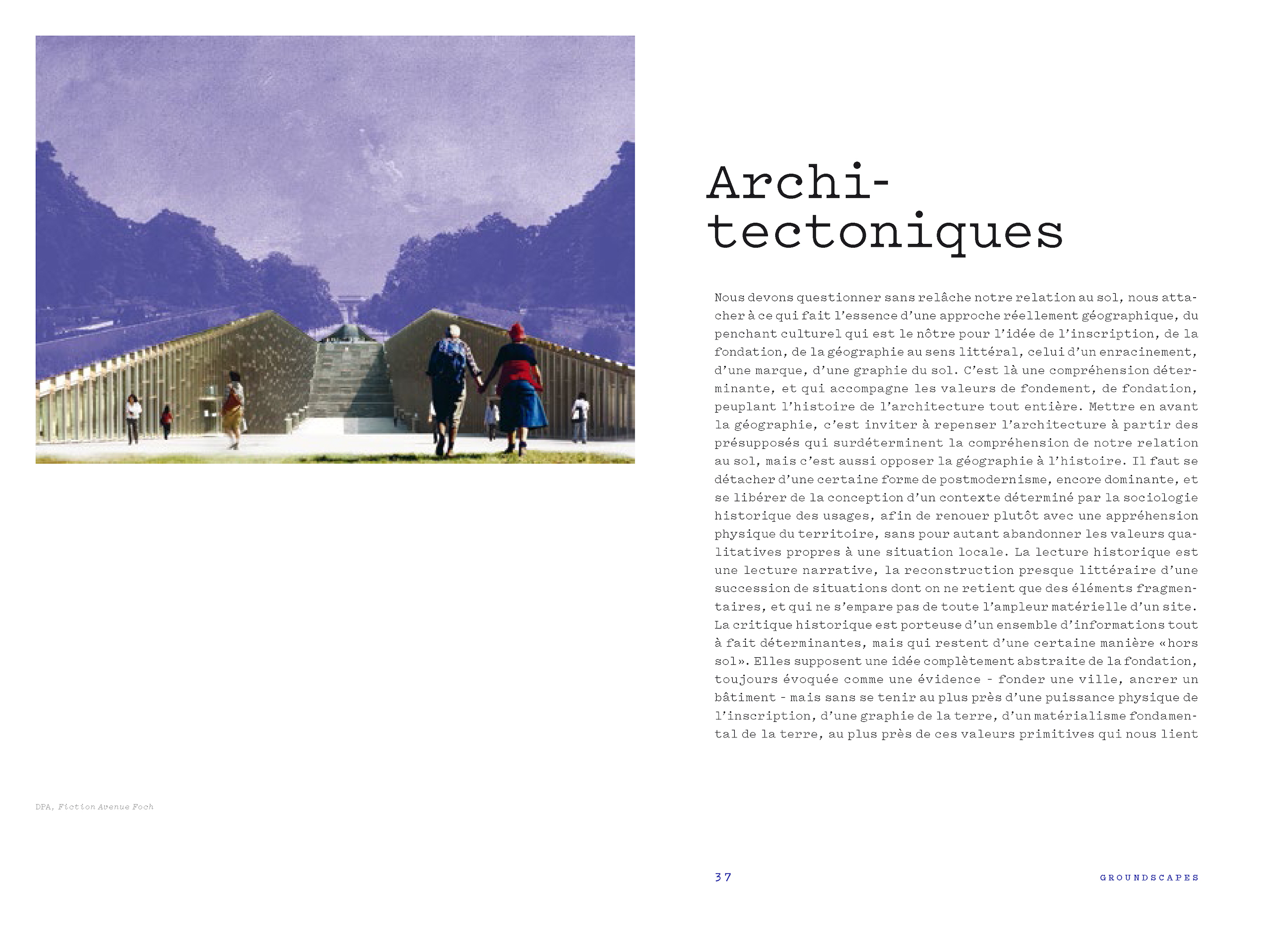 Avant toute chose P 6 - Fictions P 16 - Archi-tectoniques P 36 - L'extension de la géographie P 60 - Le vide générique P 80 - Domaines de la transition P 100 - Logiques de la densité P 128 - Ontologies du sol P 150 - La substance urbaine P 180