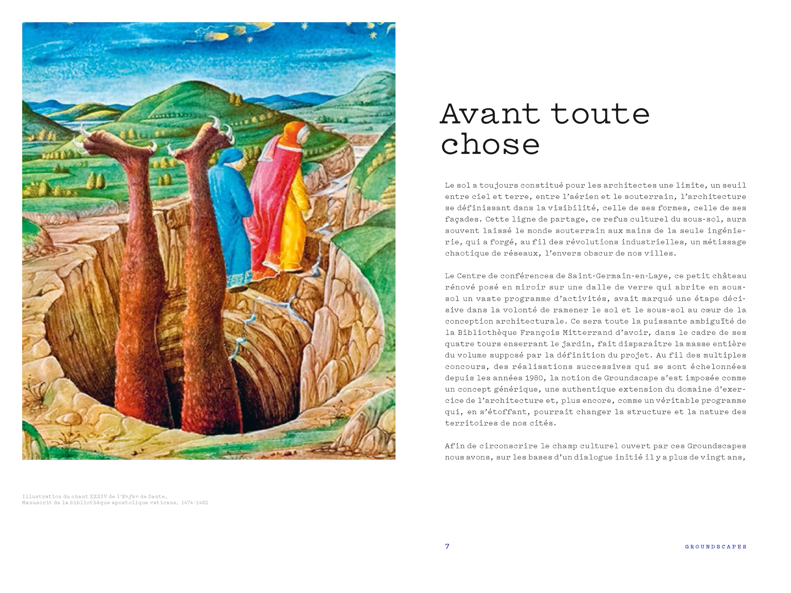 L'architecte Dominique Perrault propose dans cet ouvrage une réflexion sur l’architecture du "Groundscape". Une idée, un concept, que l’architecte explore et expérimente depuis des années au sein de ses projets et au travers de ses fictions. "Une écriture du réel, une architecture souterraine où il ne s’agit pas de vivre sous terre mais d’inscrire les lieux de vie dans la terre, cet épiderme du sol ouvert sur le ciel."