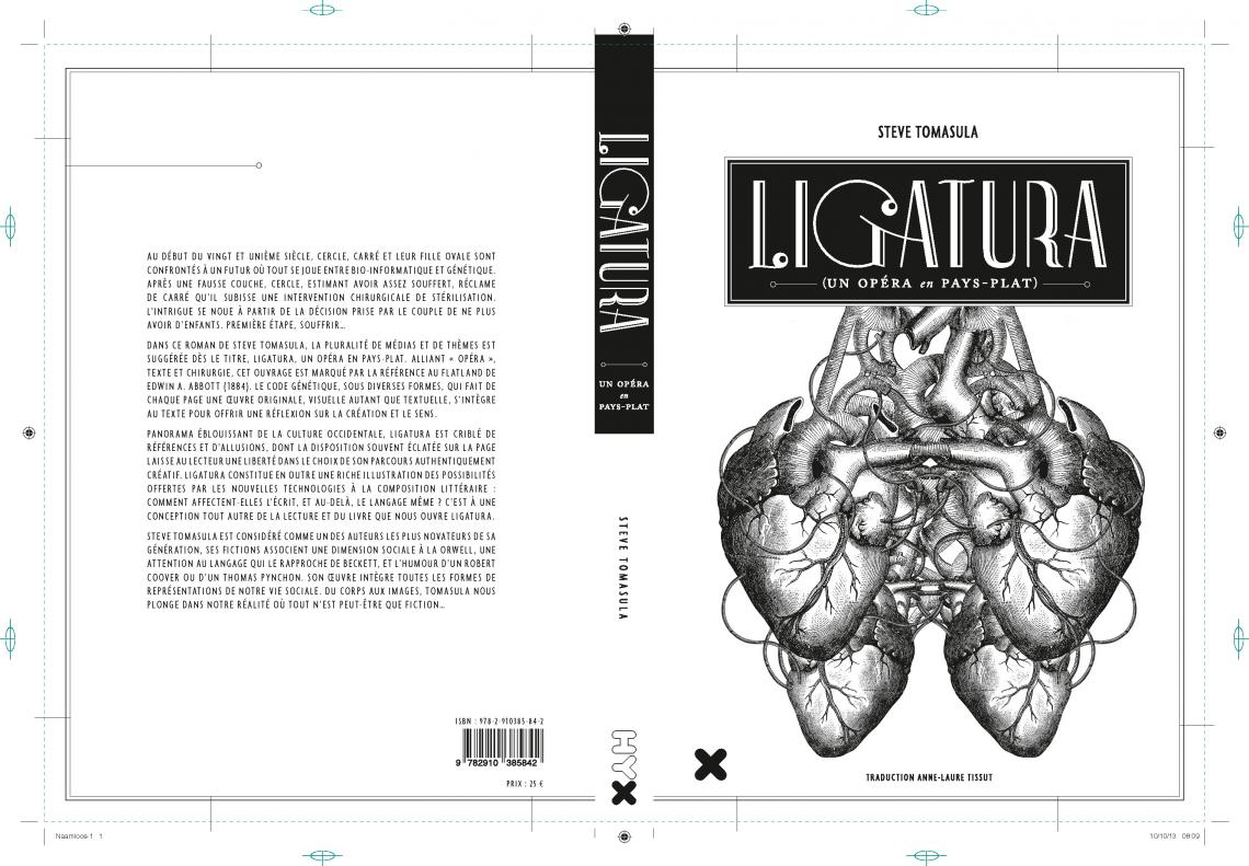 La pluralité de media et de thèmes qui interagissent "LIGATURA - Un Opéra en pays-plat" est suggérée dès le titre, alliant « opéra », texte et chirurgie. Marqué par la référence intertextuelle au Flatland de Edwin A. Abbott (1884), le titre porte aussi l’inscription de la dimension métatextuelle du livre, plat pays s’il en est, ayant pour personnages principaux Square et Circle, et leur fille Oval. L’intrigue se noue à partir de la décision prise par le couple, après une fausse couche, de ne plus avoir d’enfants. Circle, estimant avoir assez souffert, réclame de Square qu’il subisse une intervention chirurgicale de stérilisation. Le code génétique, sous diverses formes, faisant de chaque page une œuvre originale, visuelle autant que textuelle, s’intègre au texte pour offrir une réflexion sur la création et le sens.